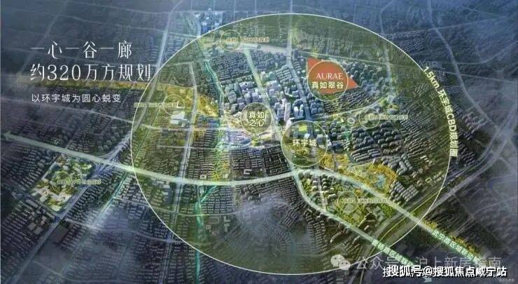 以环宇城为圆心蜕变1.5km圈,围绕“一心一谷一廊”规划。一心-真如之心、一廊-真如绿廊、一谷-真如翠谷。