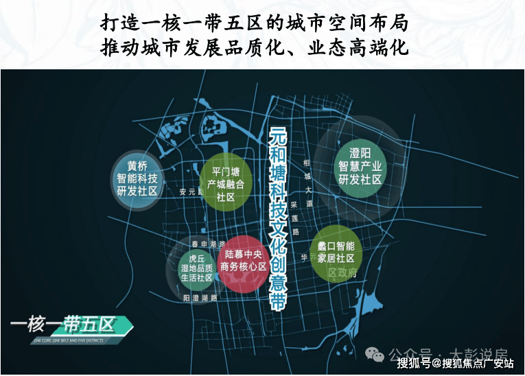 苏州编修中的新一轮城市总体规划(2035), 为了更好地实现全域城市化,着力打造城市经济,相城在“七个街道、四个镇、一个度假区”行政格局基础上,提出了重点打造 五大功能片区” ,即阳澄生态新区(高铁新城)片区、潘湖国家级经济技术开发区片区、黄高新区片区、元和高新区片区、阳澄湖生态旅游度假区片