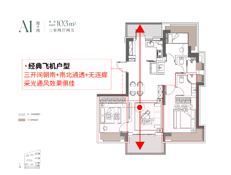 建面约120㎡3房2厅2卫,做到了3开间朝南+双阳台+主卧套房设计+270°转角飘窗,居住体验、舒适度、尺度感倍增。