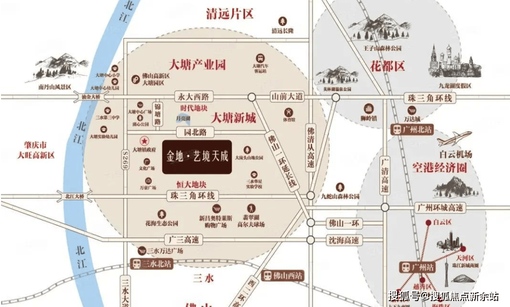 金地艺境天成位处三水大塘新城中心,东靠广州白云花都,西连肇庆高新区,北向清远,南接佛山中心,刚好处于广佛肇清四城交汇点,周边已建立起三横四纵高速网络,半小时生活半径辐射“2高铁(广州北站+三水南站)、2机场(白云机场+高明机场)、2轻轨(广州北站+三水北站)、1港口(北部唯一重大港区——大塘港区)”,随着未来交通便捷性将持续优化升级,区域规划价值进一步兑现。
