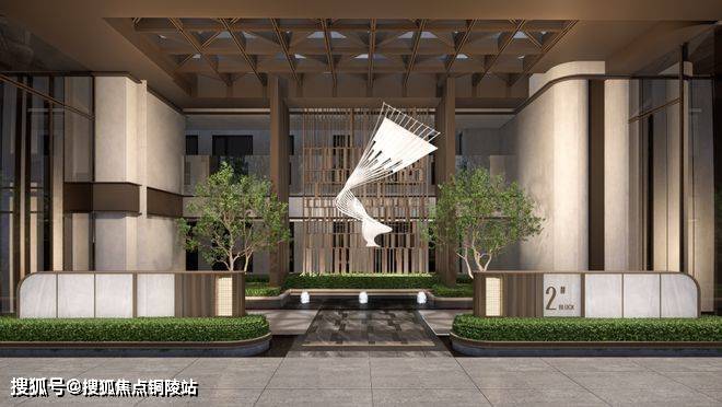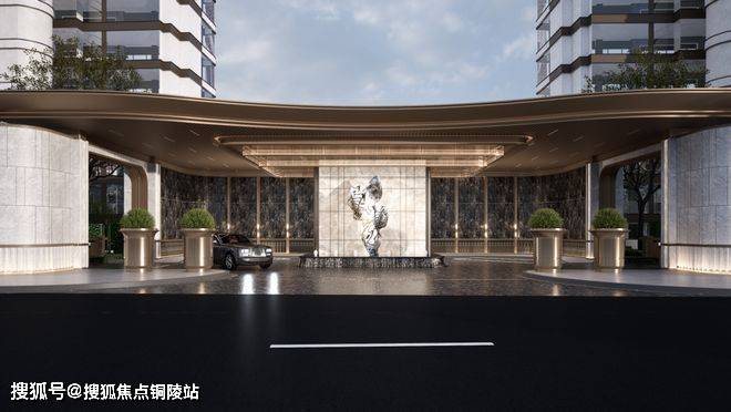 ,彰显大气的特色。挑高金属雨棚采用极细边,中间凿壁采用透光奢石,搭配极具现代主义的雕塑彰显小区档次,背景墙面采用维多利亚黑大理石,奢华且低调。