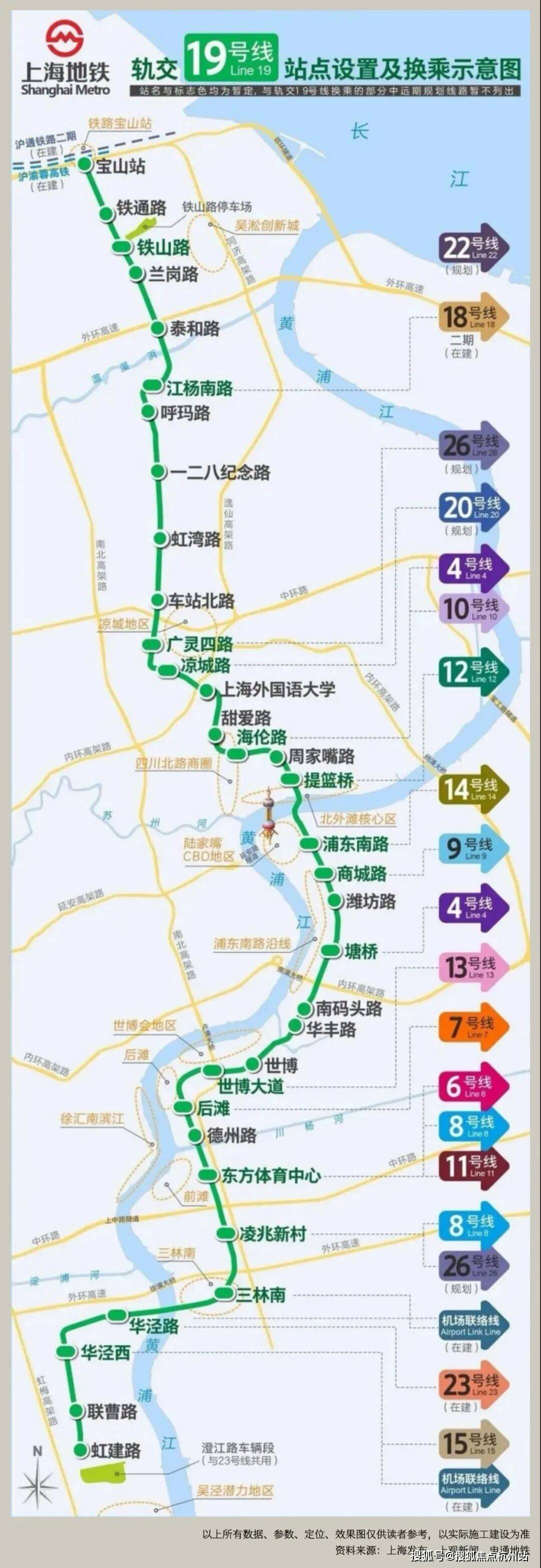 地铁19号线(北段[宝山站 到一二八纪念路]在建,预计2027年通车),直达陆家嘴、北外滩、杨浦滨江,沿途18站全能换乘王,串联宝山、静安、虹口、浦东、徐汇等行政区。