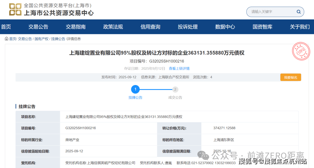 2025年11月17日,上海市公共资源交易中心发布一则国有产权项目成交公告,中建三局所属中建壹品商置联合湖北联投成功竞得上海建绽置业有限公司95%股权及转让方对标的企业363131.355880万元债权,成交总价达374271.12588万元。