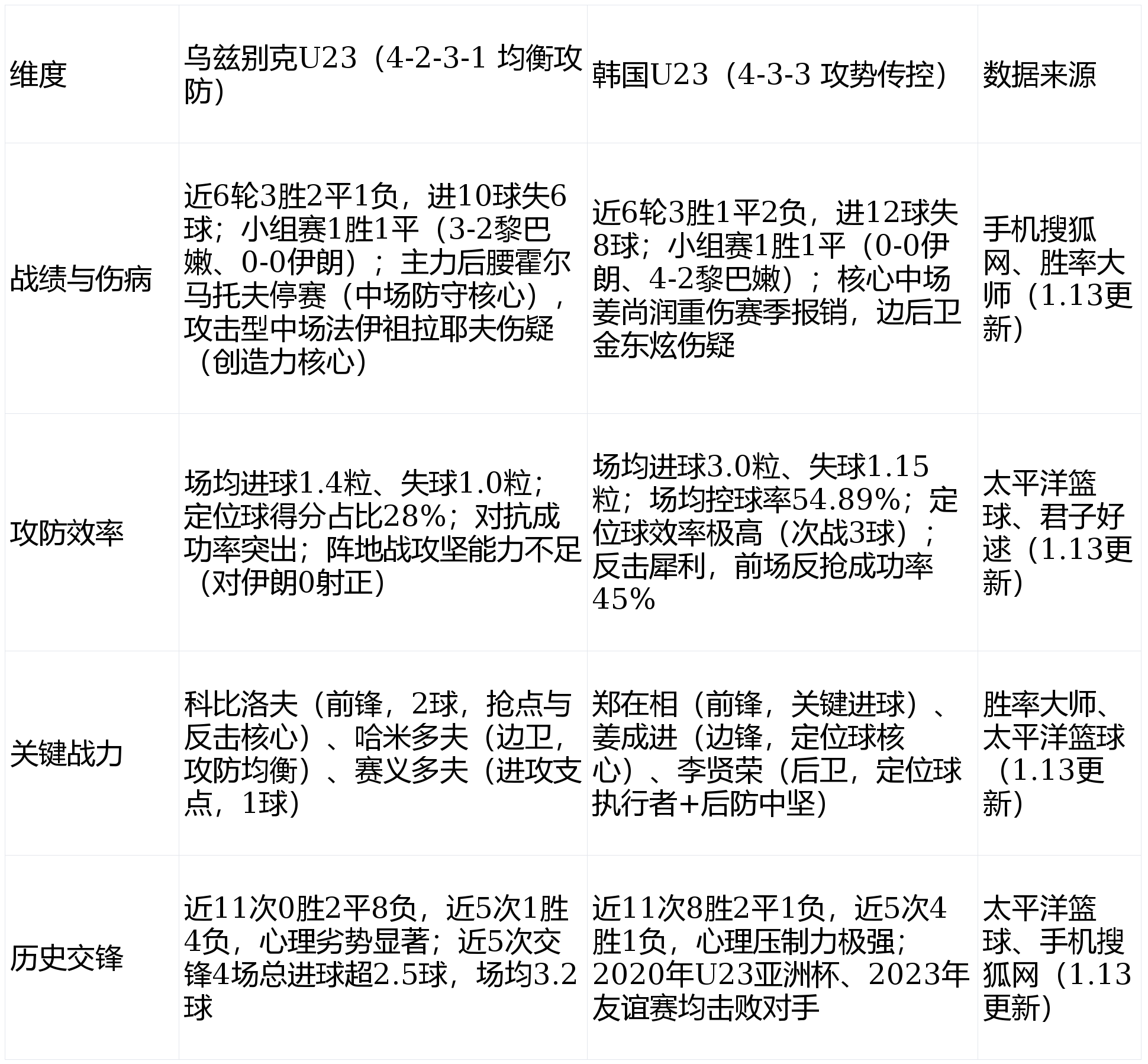 防守端前两轮展现极强抗压能力,次战0-0闷平防守强悍的伊朗印证防线稳固,后防线中卫组合高空球争顶成功率超73%,能有效遏制高空攻势。但主力后腰霍尔马托夫停赛成为致命隐患,其拦截与协防作用关键,停赛后将由仅3次U23出场经验的阿卜杜拉耶夫替补,中场硬度大幅下降,难以有效限制韩国的传控调度。此役核心策略:因“平即可能出局”的压力,开局大概率激进高位逼抢,利用身体优势打乱韩国节奏;重点依托边路传中与定位球战术发挥科比洛夫的抢点优势;同时避免领先时注意力松懈,防止被逆转,久攻不下则及时调整节奏,避免后防空虚被反击打穿。