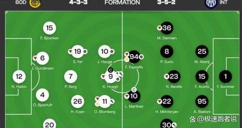 球员的跑动数据揭示了另一种碾压。 对阵国际米兰的比赛中,博德闪耀全队总跑动距离达到131.27公里,比国米多出9公里;完成147次冲刺,比对手多19次。 场上有6名球员跑动超过12公里,而国米只有2人达标。 这种不惜体能的疯跑,在低温环境下对客队球员的消耗是致命的。