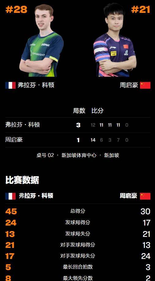球速体育,球速体育官方网站,球速体育APP下载北京时间2月24日下午,新加坡体育中心的乒乓球台边,记分牌定格在7比11。周启豪放下球拍,这场男单32强的比赛结束了。世界排名第21位的他,以1比3输给了对面那个17岁的法国少年弗拉维安·科顿。四局比分是14比12、6比11、3比11、7比11。整场比赛用时33分钟。