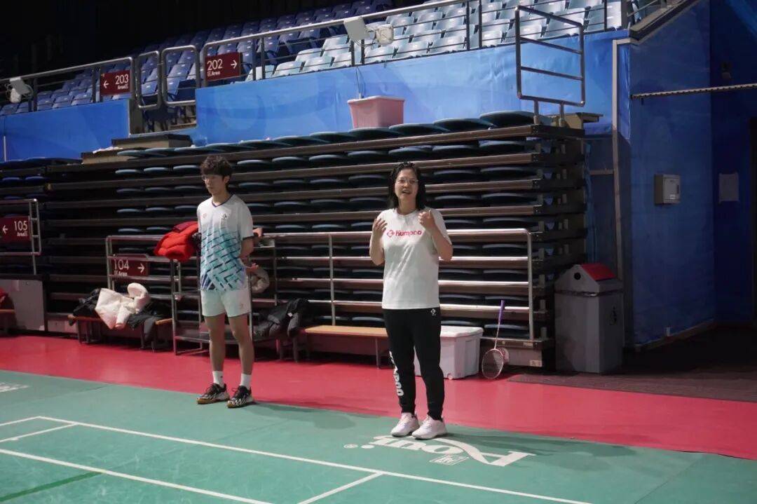 随后,欧阳泽蔓和两位羽毛球队的同学一起,带领大家进行热身准备活动,通过单脚站立、半蹲跳等动作和小游戏来活动全身各个部位。