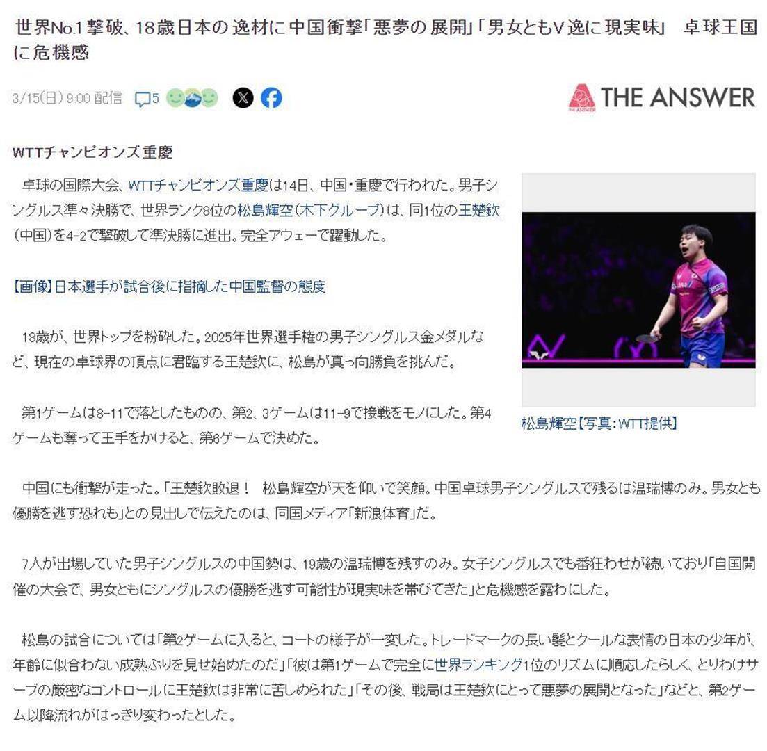 这已经不是松岛辉空第一次给王楚钦制造麻烦了。 两人的最近四次交手,战绩变成了2胜2负。 2025年亚锦赛团体赛,松岛辉空就曾以3-2击败过王楚钦。 去年12月的WTT香港总决赛,他在大比分领先的情况下被王楚钦逆转,赛后曾落泪。 不到三个月,他就在重庆完成了“复仇”。 日本媒体《The Answer》在赛后迅速发文,称这位18岁的日本天才令中国乒坛震惊,并渲染“乒乓球强国陷入了危机感”。 文章指出,中国男单仅剩温瑞博一人,女单也只剩王艺迪和蒯曼的内战,日本队有望在本届赛事拿到两枚金牌。