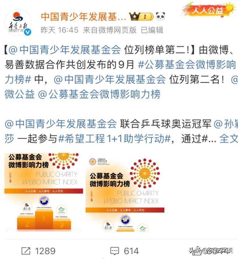 这个榜单来源于微博与易善数据,联合发布的《公募基金会微博影响力榜》。在2025年9月,中国青少年发展基金会联合孙颖莎发起的“希望工程1 1助学行动”荣获第二名。该项目主要帮扶对象是外卖骑手、快递员、网约车司机等新就业群体的子女,为他们提供教育支持。