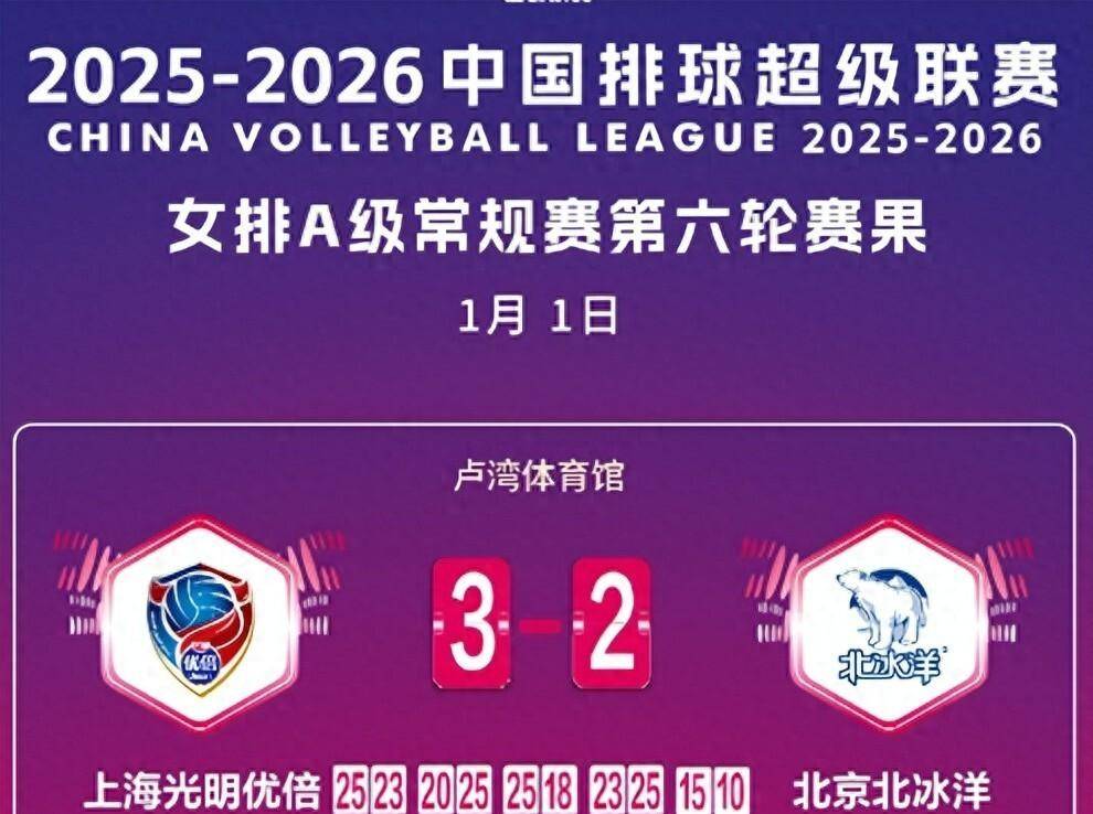 2026年1月1日晚上,卢湾体育馆,排超联赛新年揭幕战的气氛都快把屋顶掀翻了。 上海光明优倍女排和北京北冰洋女排硬是打满了五局,最后上海队才以3-2(25-23、20-25、25-18、23-25、15-10)啃下了这块硬骨头。